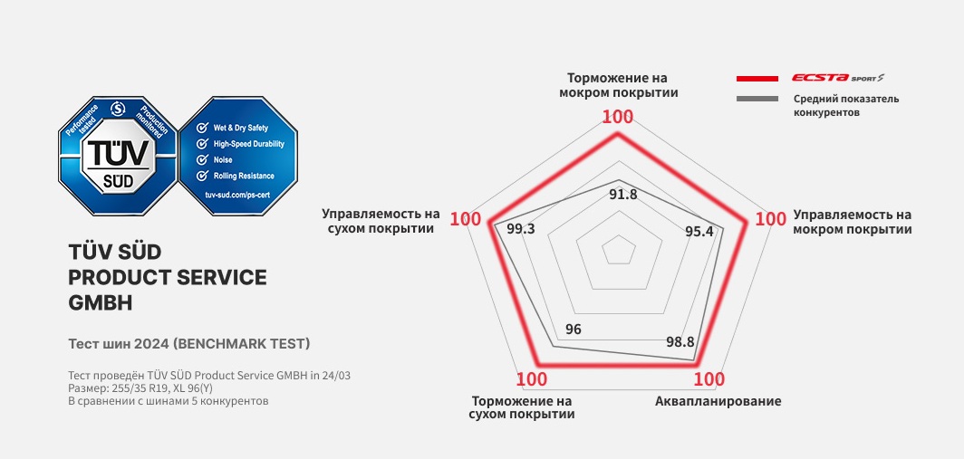 Шины ECSTA Sport особенно впечатлили команду Die Reifentester своими характеристиками на мокрой дороге: торможение на 23,07 м со скорости 80 км/ч, это лучший результат среди шин, участвовавших в тесте.